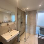 - hochwertiges Badezimmer mit Waschmaschinenanschluss, bodentiefer Dusche und Glasduschwand