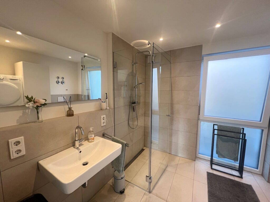 - hochwertiges Badezimmer mit Waschmaschinenanschluss, bodentiefer Dusche und Glasduschwand