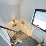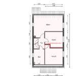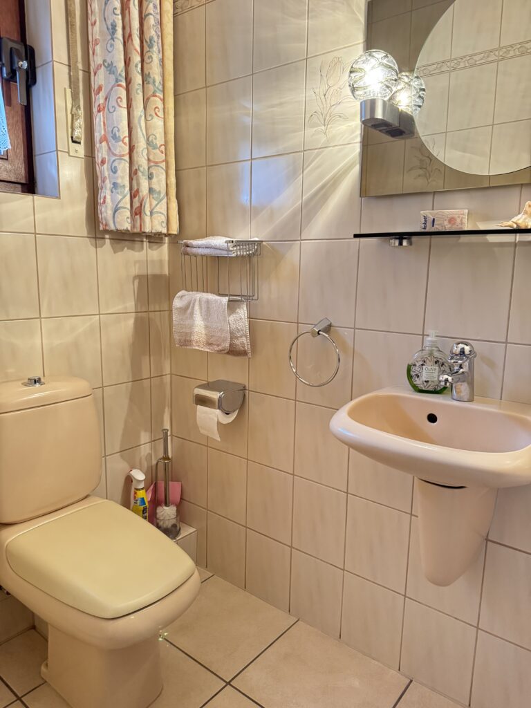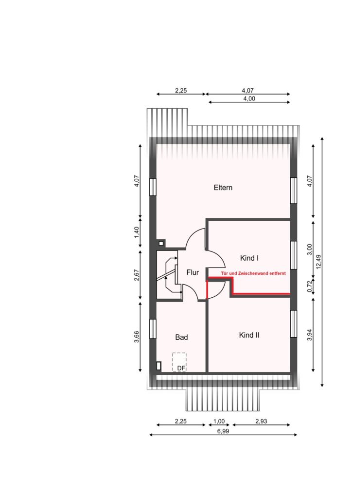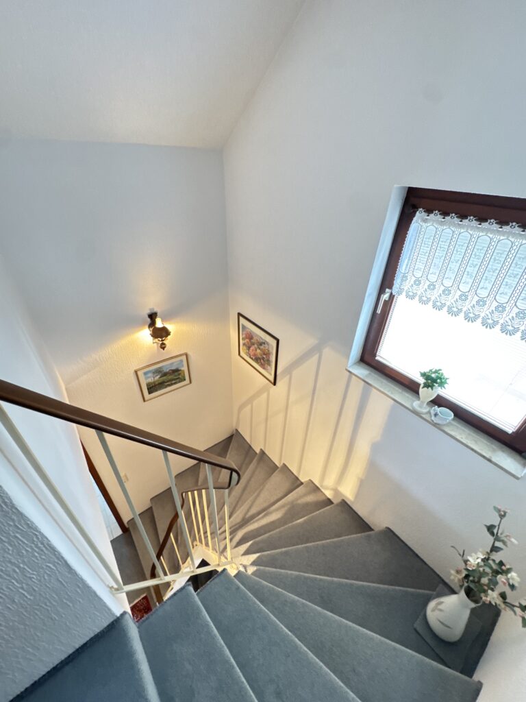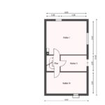 - Obergeschoss: Flur, Badezimmer, zwei Zimmer (ehemals drei Zimmer, zwei wurden vereint)