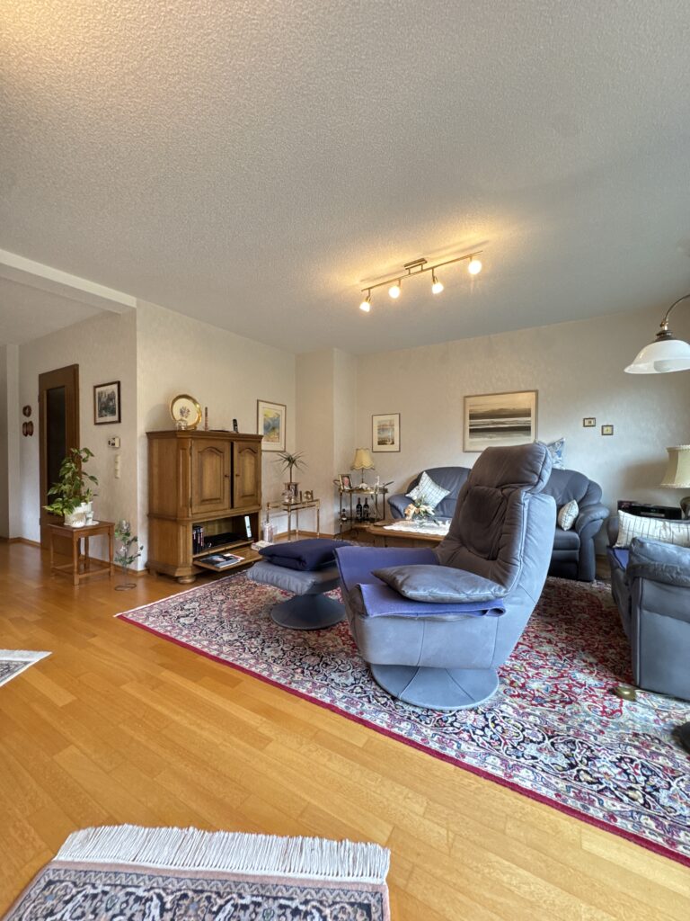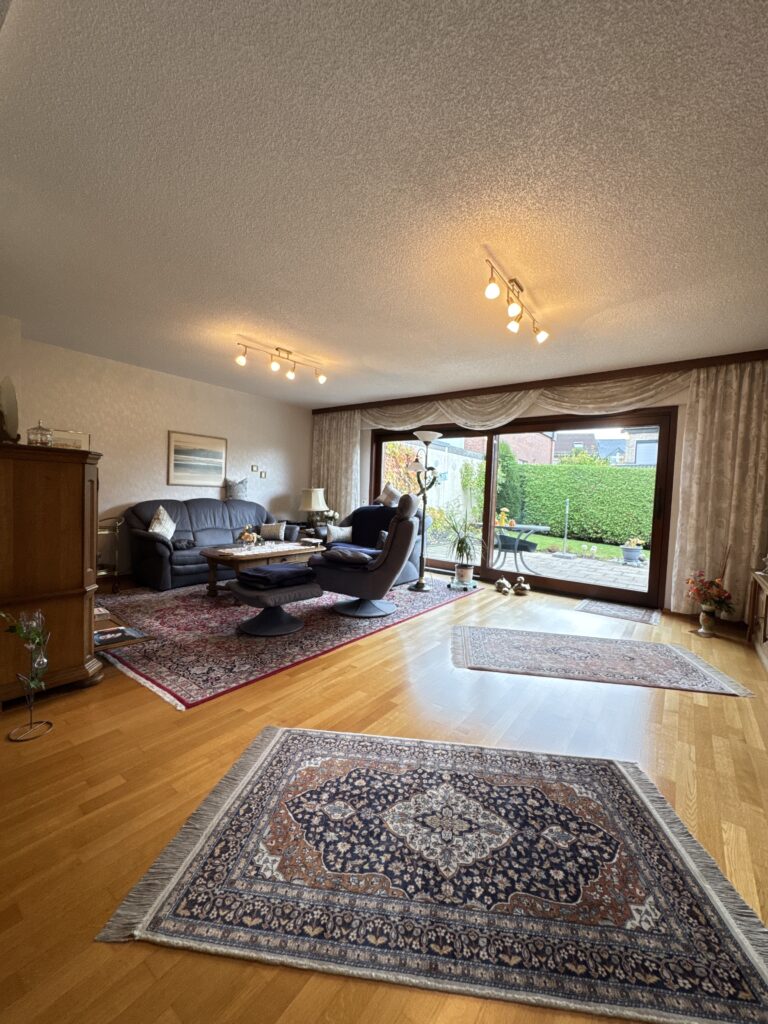 Allgemeine Ausstattungsmerkmale: Isolierverglaste Holzrahmenfenster (überwiegend Baujahr 1999) mit elektrischen Rollläden im Erdgeschoss (restliche Rollläden werden manuell betriebenen), Gas-Zentralheizung (Baujahr Wärmetauscher 1987) mit zentraler Warmwasseraufbereitung, Parkettfußboden im Wohnzimmer (ansonsten Teppich- und Fliesenfußböden), elektrische Sonnenmarkise im Garten, Garagenstellplatz etc.