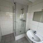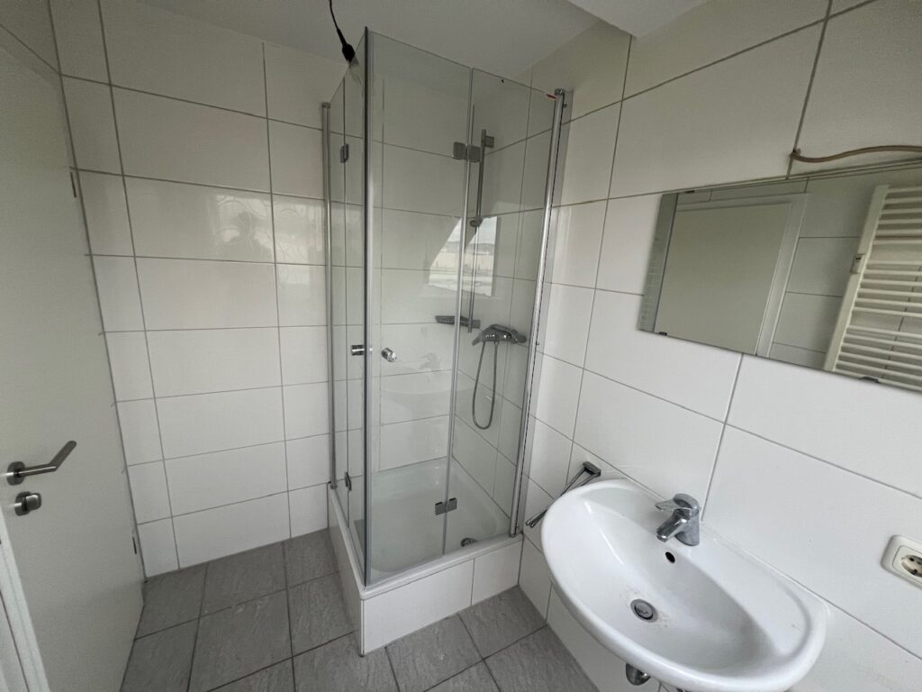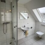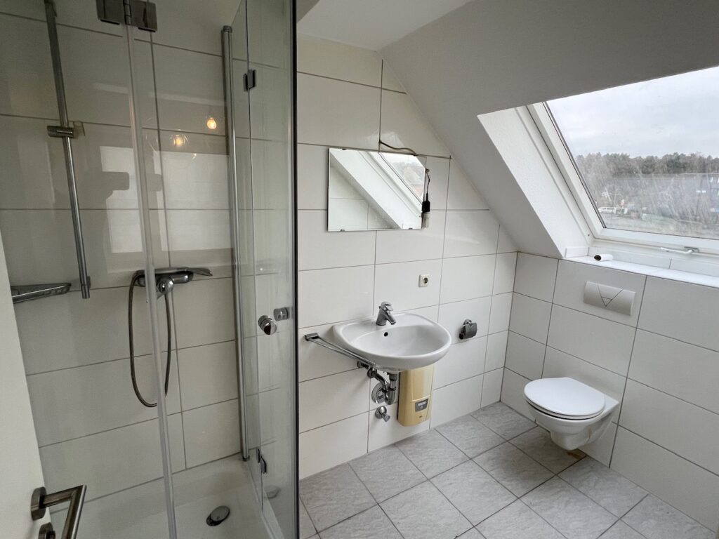 Das Badezimmer verfügt über eine Dusche, ein WC, ein Waschtisch, ein Dachflächenfenster und über einen Handtuchheizkörper.