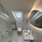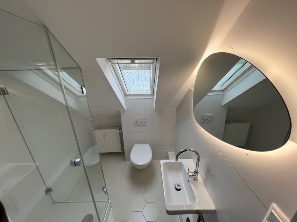 - Saniertes Badezimmer mit Dusche, Glasduschwand, Waschtisch und Tageslichtfenster