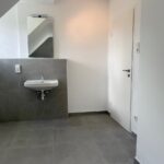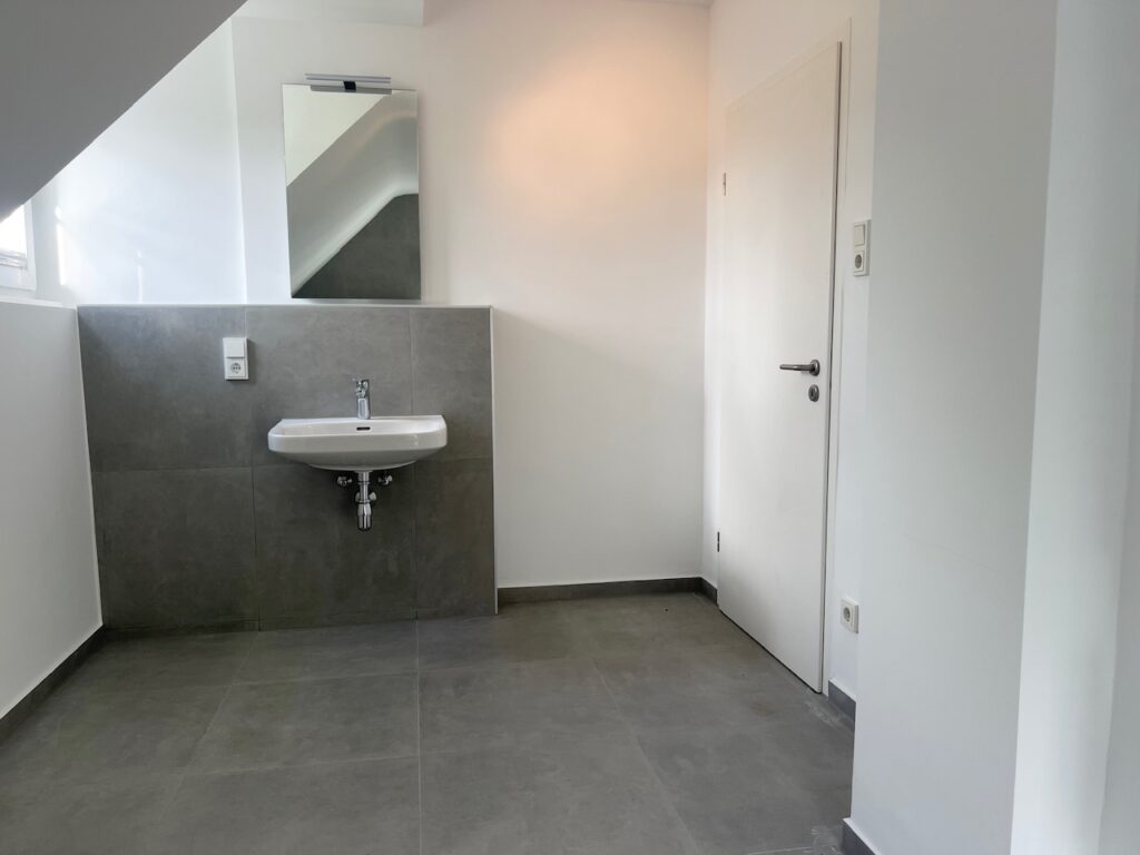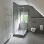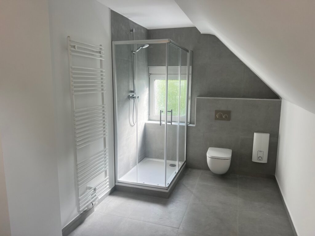 Das Tageslichtbad wurde vor Mietbeginn umfassend saniert und mit einem Waschbecken, einem WC, einer Dusche mit Glasduschwand und einem Handtuchheizkörper ausgestattet.