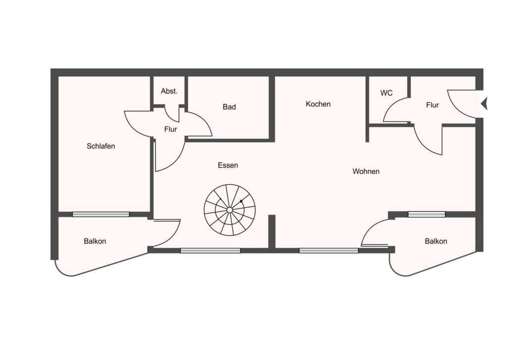 Flur mit Gäste-WC, großzügiges Wohn- und Esszimmer mit Kochnische und direkten Zugängen zu zwei Balkonen mit Ost-Ausrichtung, Schlafzimmer, Badezimmer und Abstellraum.